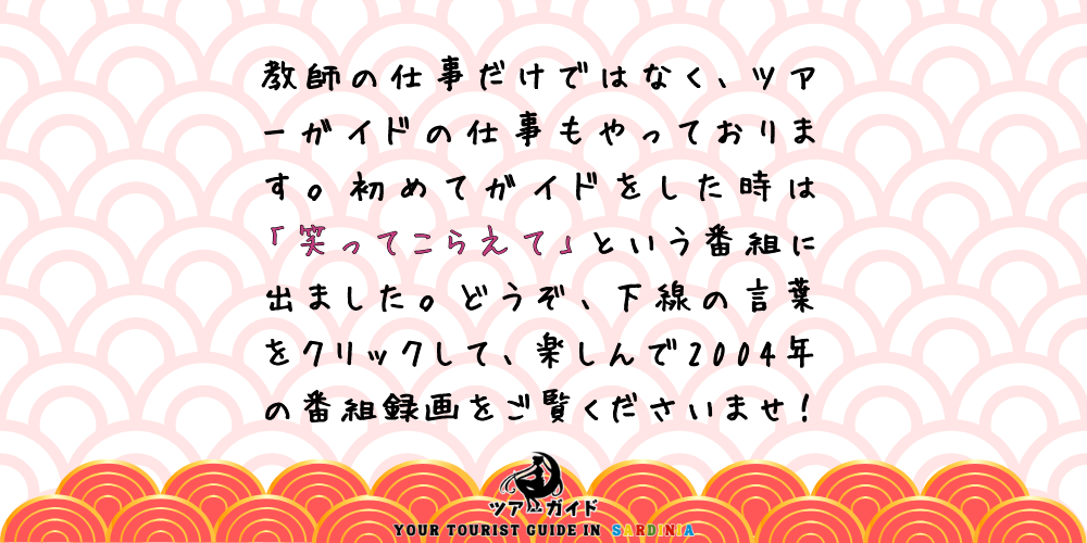 教師の仕事だけではなく、ツアーガイドの仕事もやっております。初めてガイドをした時は 笑ってこらえて という番組に出ました。どうぞ、下線の言葉をクリックして、楽しんで2004年の番組録画をご覧くださいませ!